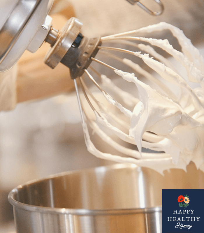 I use my KitchenAid stand mixer—it whips the egg whites to stiff, glossy peaks in just a few minutes. A handheld mixer can work too but may take longer.