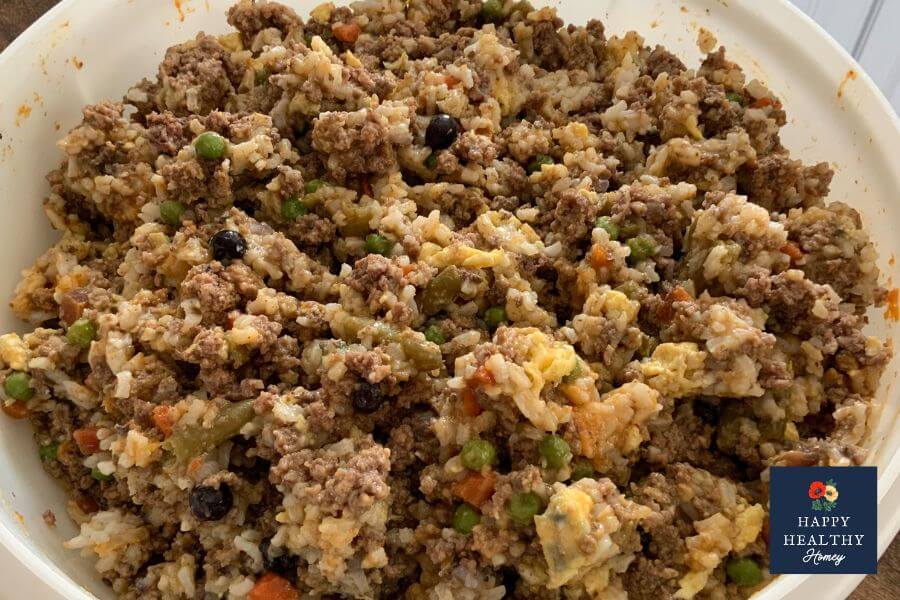 - In a large container, combine the cooked rice, meat (with juices), scrambled eggs, cooked vegetables, pumpkin, blueberries, and bone meal (if using). Mix well.